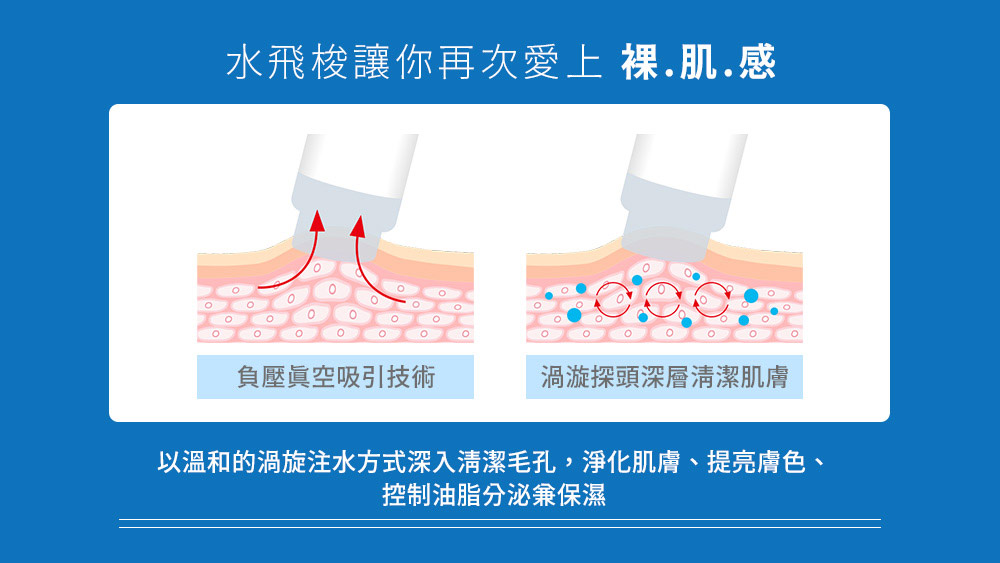 由於保養肌膚的基礎在於「清潔」與「保濕」,能夠好好做到清潔與保濕,膚質幾乎不會太差,而水飛梭的發明絕對是美容領域的偉大貢獻之一,獨特的探頭,利用水渦流技術,徹底沖洗毛孔,帶走油脂、老廢角質、粉刺,並幫助縮小毛孔,讓毛孔深呼吸,也同時達到保濕,使肌膚細緻又亮白喔!