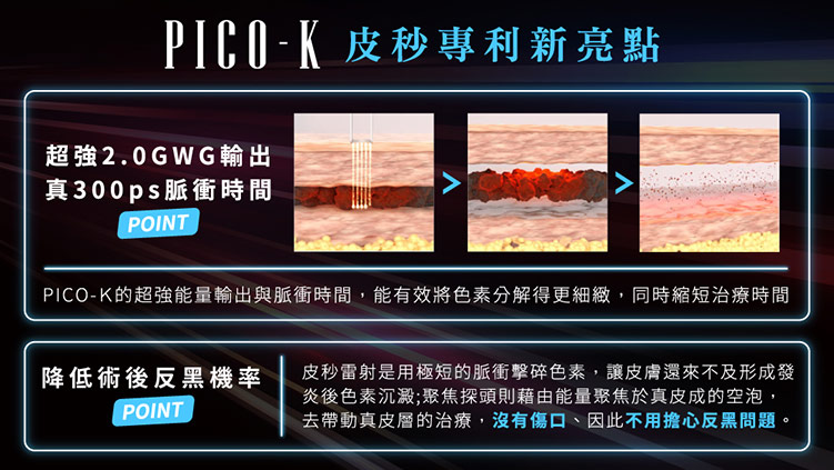 PICO K 皮秒雷射,是以醫美技術聞名的韓國大廠研發,不但更貼近亞洲人的膚況,並擁有專利技術300ps脈衝持續時間與最佳輸出2.0GW的瞬間功率,達到快速、精準的皮秒功效,最重要的是無開放性傷口,且大大降低術後反黑的機率,術後可正常作息、上班。