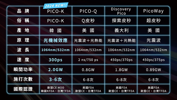 晶鑽診所引進的PICO-K皮秒雷射機型,是專為亞洲人膚質設計開發的全新一代皮秒雷射機器,目前已取得歐盟CE MDD、韓國KFDA及台灣TFDA的上市許可。
