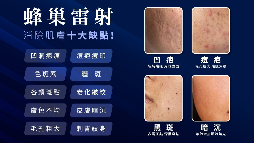 蜂巢皮秒的脈衝能量在透過蜂巢瞬效透鏡後,產生12倍的能量聚焦,結合雙波長可掃除肌膚上的紅色素與黑色素,能量的震盪波會傳遞到真皮層,讓肌膚啟動修復機制,形成膠原蛋白及彈力纖維再生,皮秒蜂巢具有改善凹洞、凹疤、毛孔粗大、皺紋等皮膚問題。