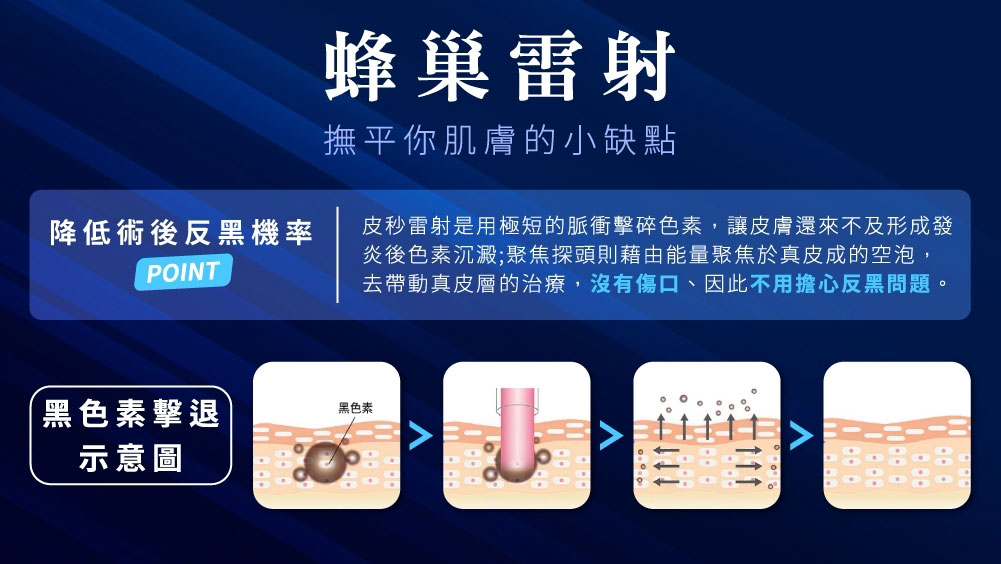 傳統雷射的治療原理是光熱效應,透過黑色素吸收熱能後炸破黑色素,熱能累積就易反黑;PICO-K蜂巢皮秒雷射利用極短脈衝輸出所產生的光震波效粉碎黑色素,降低雷射熱能破壞力、較不易傷害皮膚組織,所以大大降低反黑的風險。