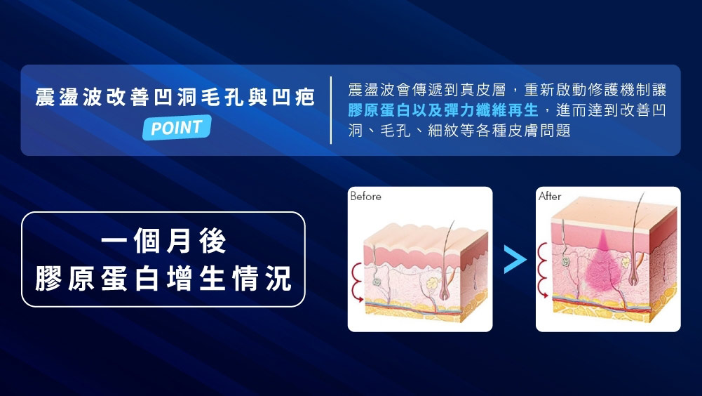 蜂巢皮秒除了擁有皮秒雷射改善膚色、淡化斑點的功效外,蜂巢皮秒的蜂巢探頭更能加強光震波的能量,達到空泡效應(Laser Induced Optical Breakdown – LIOB),使肌膚啟動再生機制,因此有強烈想改善皮膚凹痘、陳年痘疤、粗大毛孔、深層斑點甚至是刺青紋身的人,都可以嘗試看看蜂巢皮秒的效果喔!