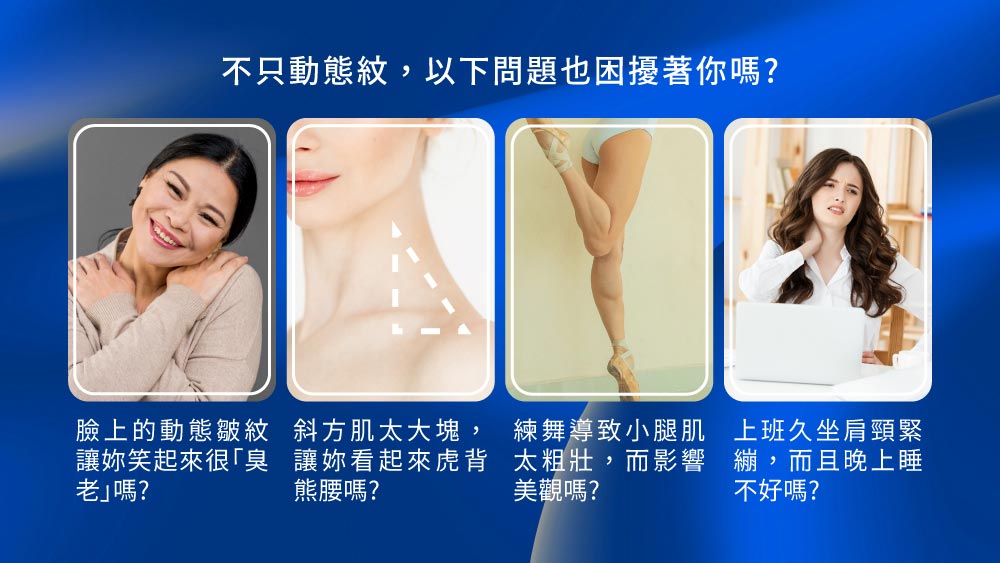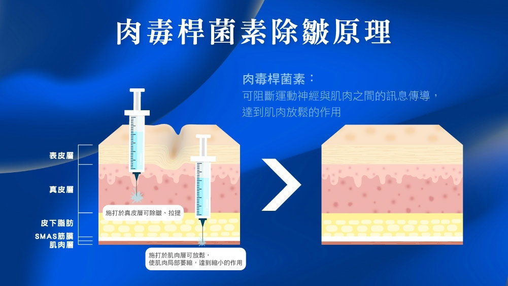 透過施打肉毒桿菌在真皮層可以達到皺紋放鬆、拉提的效果。