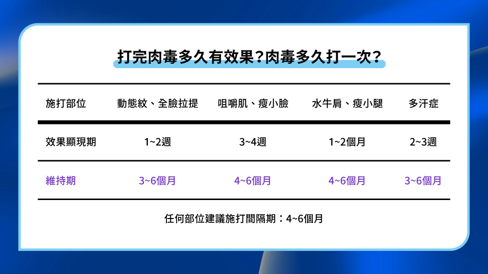 注射劑量、部位及使用產品不同,個人體質及肌肉強度也不相同,因此注射後成效維持期長短也不相同,所以相對的肉毒多久打一次也只能預估一個大概的時間。