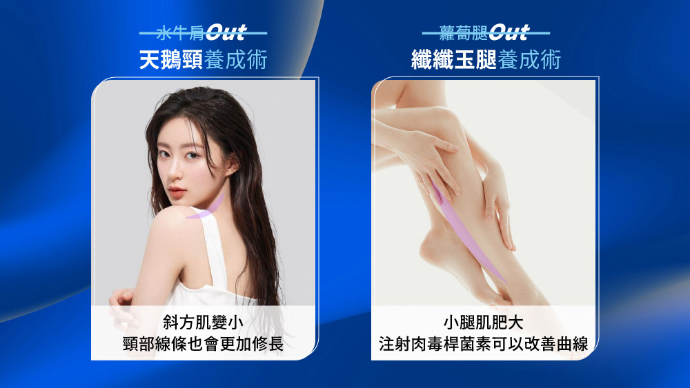 肉毒施打進肌肉層,可幫助肌肉放鬆,進而達到肌肉萎縮,許多人常有的姿勢不良導致的施力過重的咀嚼肌發達、斜方肌肥厚、小腿肌壯碩的問題,都可以透過施打肉毒桿菌素得到緩解,肉毒施打在咀嚼肌可以瘦小臉,施打斜方肌可改善虎背熊腰,夏天可以放心地穿露背,展現修長的頸部線條,施打小腿肌可讓小腿有纖細的效果。