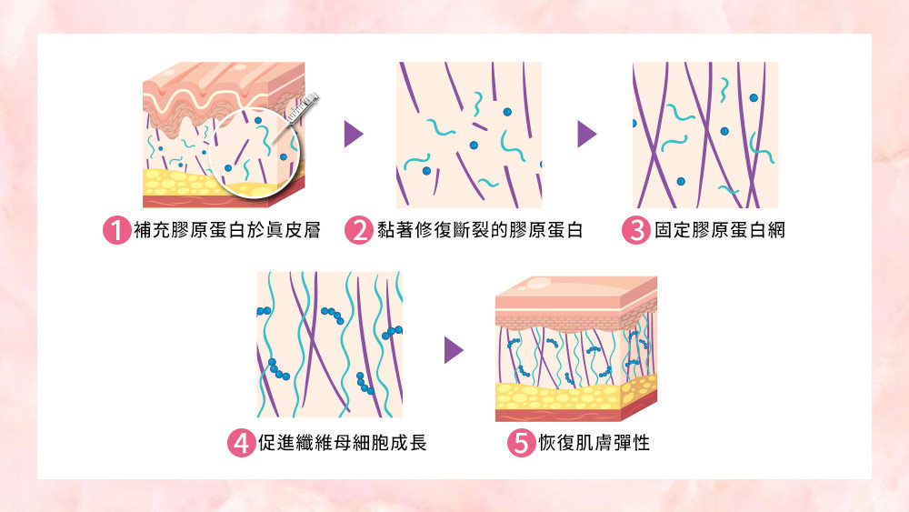 肌膚80%以上是由第1型膠原蛋白組成,經由注射膠原蛋白直接提供肌膚再生所需胺基酸養分,維持肌膚年輕化。