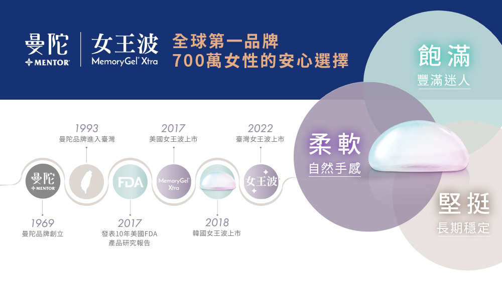 Mentor曼陀女王波,來自美國嬌生集團,是享譽國際的乳房植體品牌,擁有美國FDA核可,且安全保固,全球超過700萬名女性選擇女王波,40多年來Mentor曼陀女王波始終秉持著「Behind All Breasts」,以科研美學與嚴謹的數據支持著每一位女性與醫療人員。
