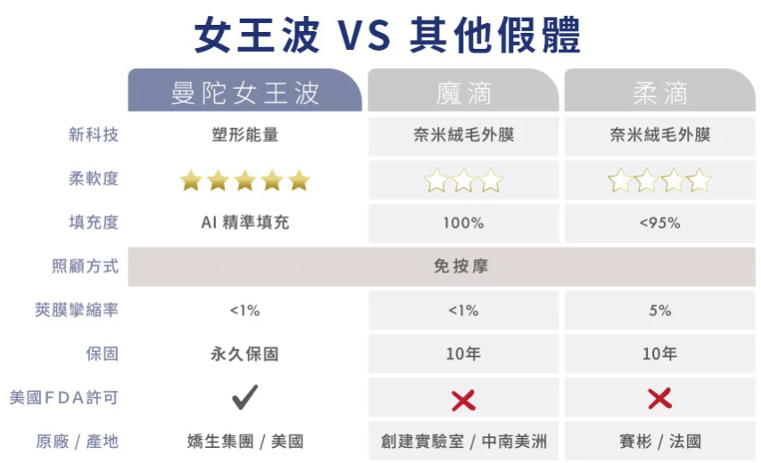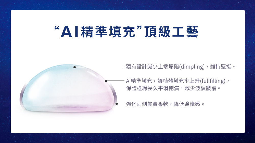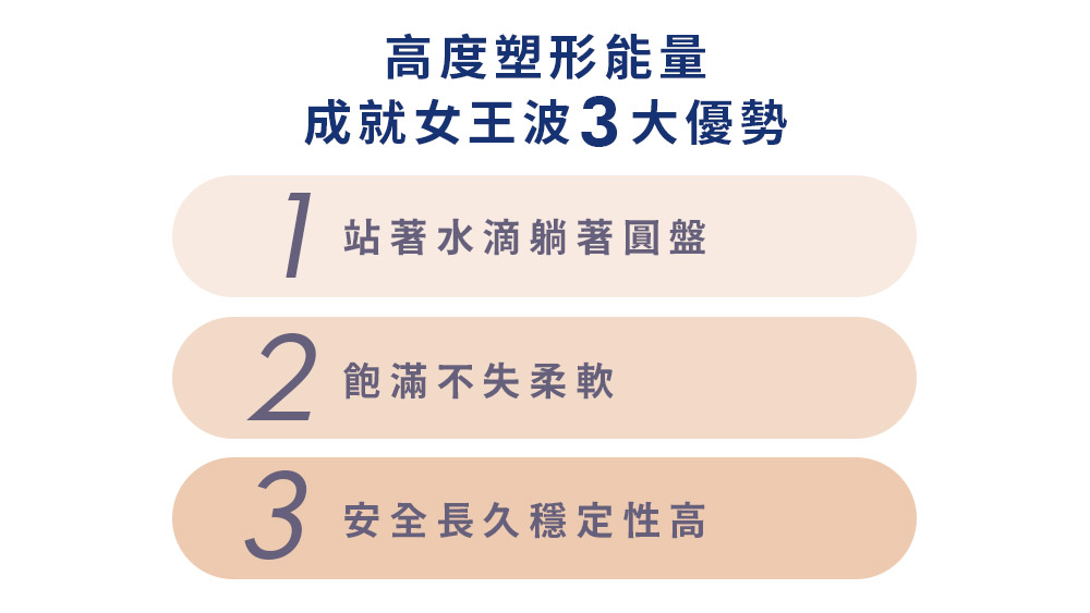 女王波獨家導入AI精準填充技術,以保持柔軟為最大前提,計算植體最適合的膠體量,配合外膜800%的極致延展力,達成頂部堅挺兩側柔軟的力學設計,兼顧飽滿與柔軟,並且展現及時的回彈力,讓觸感真實軟嫩,女王波更是擁有盲測手感第一名的殊榮。