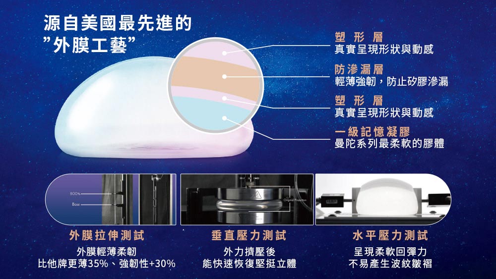 美國嬌生,女王波的外膜工藝,有獨家力學設計,底部堅挺、兩側柔軟,超薄3層外膜,擁有800%極緻的延展力。