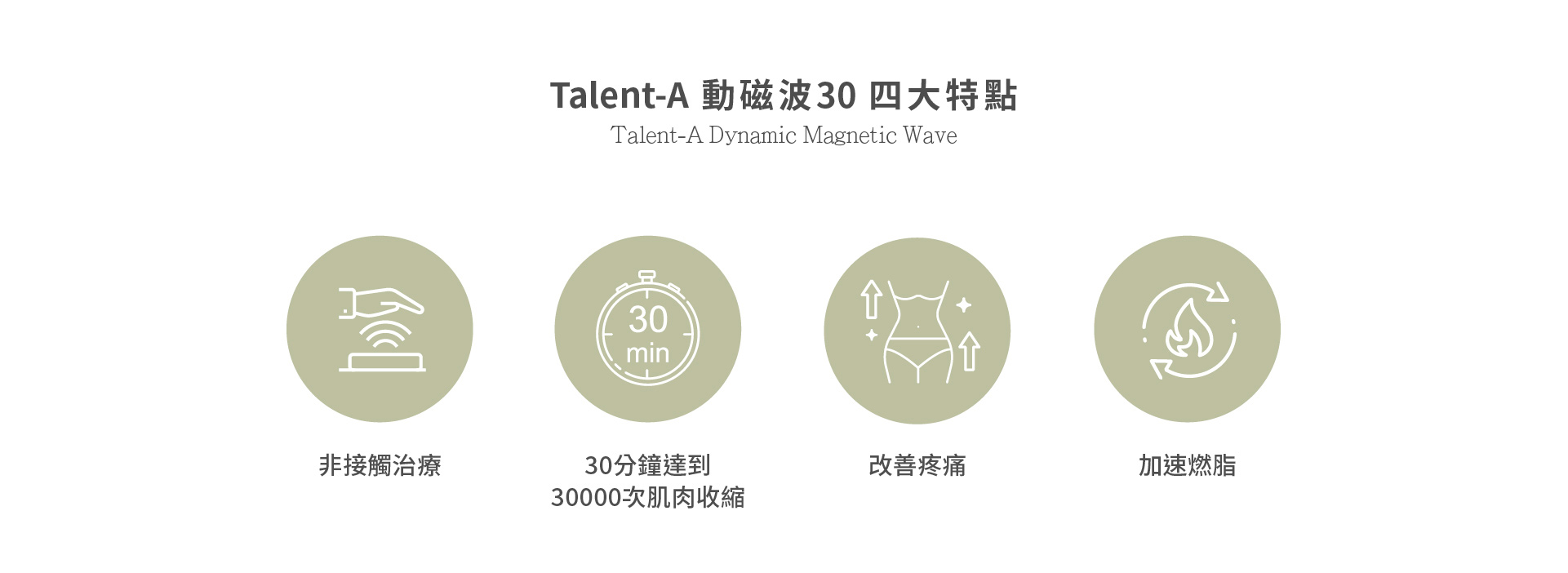 Talent-A 動磁波利用高強度聚焦電磁場技術,透過渦電流來刺激運動神經元,從而強化不同層次的肌肉,促進肌肉收縮。這項技術可以在短短30分鐘內達到30,000次運動收縮的效果,有效增強肌肉的密度和緊實度,改善血液循環,幫助舒緩肌肉與關節的疼痛,同時提升關節的靈活度。