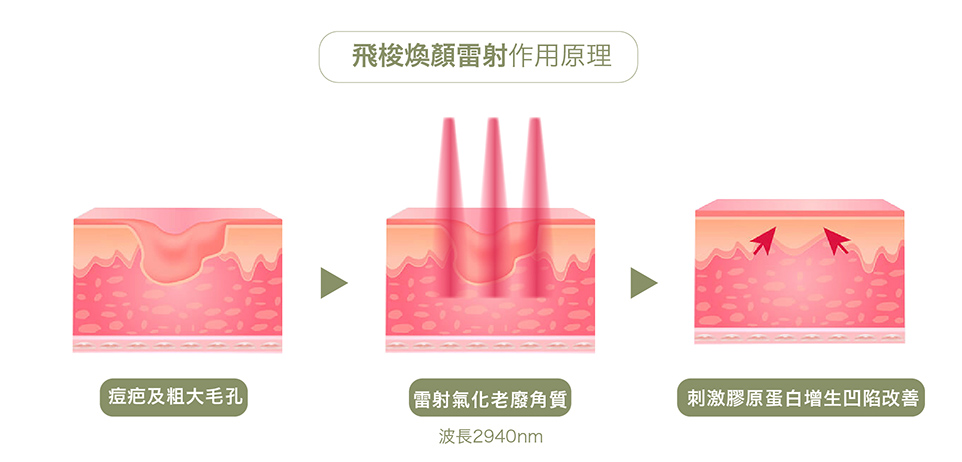 飛梭煥顏雷射是一種點狀式的分段式換膚,非全面性破壞,在同樣大的面積裡射出許多微細的光束,皮膚有很大的部分是沒有接受到雷射作用,藉由這些既存的健康組織來加速傷口癒合,運用皮膚的自癒機制,創造健康的全新皮層。能夠深層修護肌膚,促進全面更新,讓肌膚從內而外煥然一新。