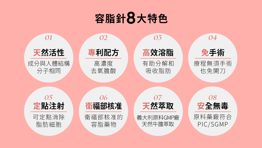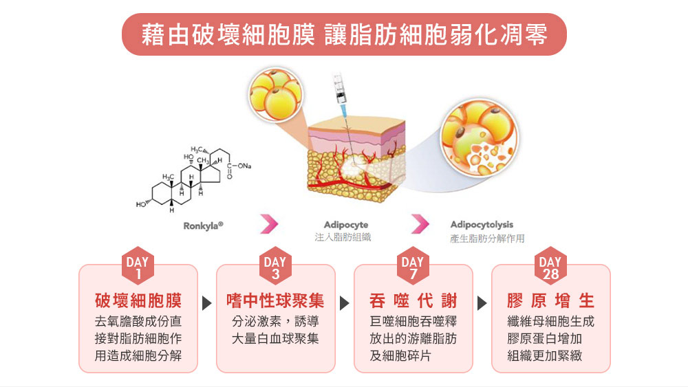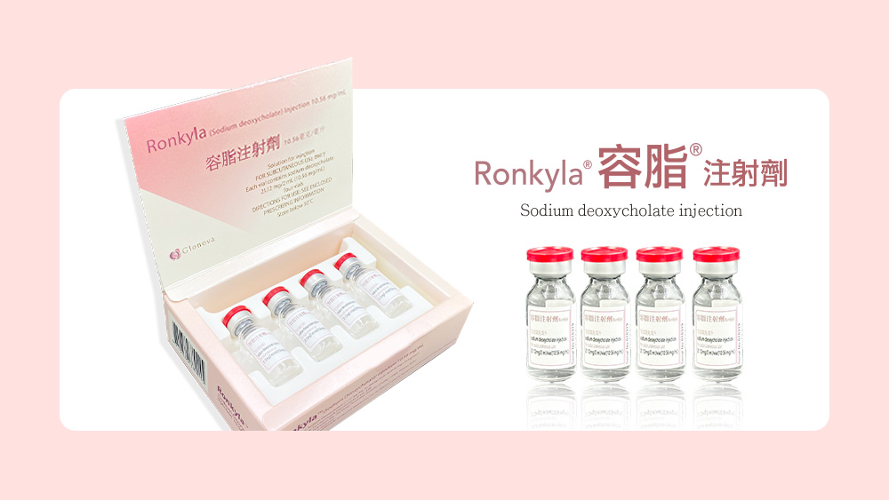 Ronkyla容脂針又稱去氧膽酸鈉注射液,適用於改善成人顎下的肥厚脂肪,可用於定點注射達到局部消脂、減脂的功效。Ronkyla容脂針中的去氧膽酸的成分可破壞脂肪的細胞膜,讓脂肪細胞達成自然分解,最後由巨噬細胞將分解出的脂肪細胞自然的代謝出體外.治療過程只需要30-60分鐘,可依照脂肪的厚度與醫師討論治療的次數與頻率,達到最好的效果喔!