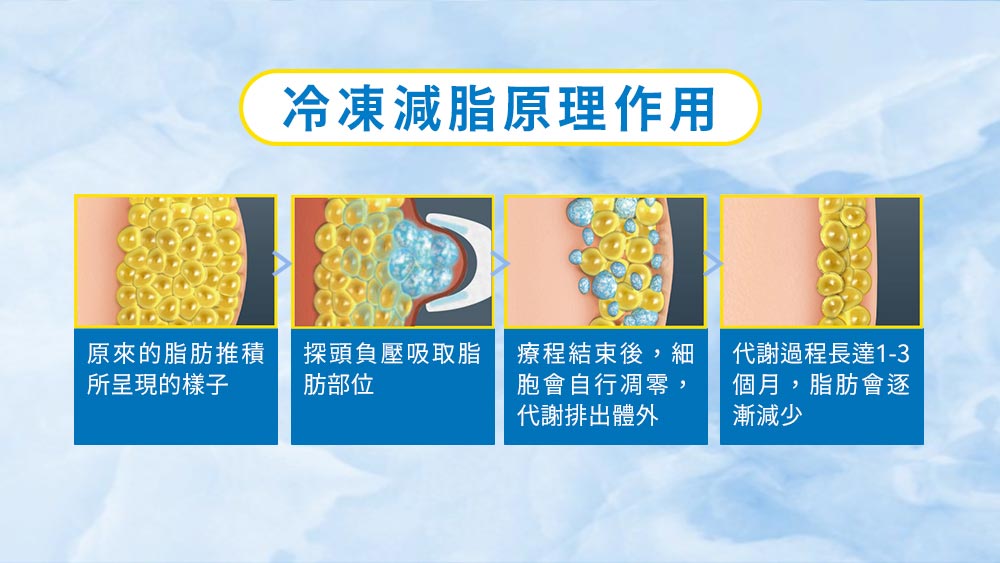 具體來說,冷凍減脂療程是透過精準的低溫控制,將脂肪細胞降至冰點以下,使其結晶化。 這些受損的脂肪細胞會自然凋亡,並被身體的免疫系統,尤其是巨噬細胞吞噬代謝,最終經由淋巴系統排出體外。由於脂肪細胞的尺寸較大,不易穿過血管壁,因此被破壞的脂肪細胞並不會重新生成,達到局部減脂的效果。