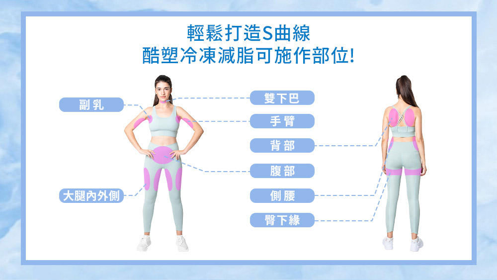 CoolSculpting 酷塑冷凍減脂適用於多個部位,包括腹部、腰部、大腿、手臂等,尤其適合局部脂肪較多的區域。