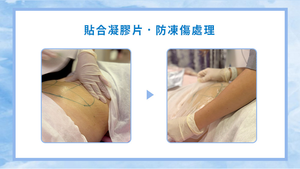 確認CoolSculpting 酷塑冷凍減脂治療部位後,會擦拭防凍傷藥水與鋪上凝膠片,做好防凍傷處理。