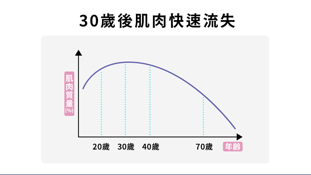 30歲開始,肌肉隨著年齡越長,老化速度越快,肌肉缺乏者,新陳代謝率也會降低,使脂肪堆積造成肥胖衰老體態。積極留住膠原蛋白的同時,你的肌肉健康也要開始維持和保養!