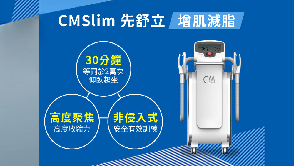 CMSlim™是先進的電磁場肌肉鍛鍊器。CMslim增肌減脂的原理,聚焦電磁場穿過皮膚和脂肪,有效刺激肌肉收放運動,提供密集連續收縮,這是肌肉纖維增長的理想選擇,也能誘導老廢脂細胞凋亡。