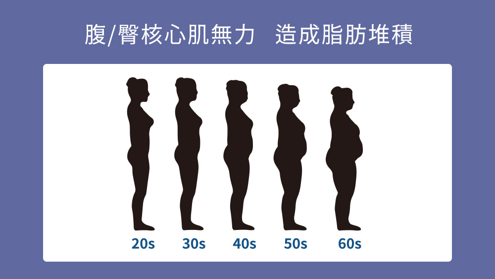 年紀增長,核心肌群無力造成脂肪堆積在腹部、臀部、背部線條不明顯,身體視覺容易呈現老態。